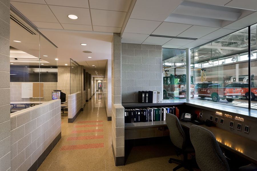 Company quarters are configured on one level with access to the apparatus room prioritized, and include sleeping and locker rooms with bathing facilities, fully equipped fitness center, dining room with commercial-grade kitchen, day room, and watch tower with state-of-the-art communications systems. Officer’s quarters are provided with office, bunk and private bathing facilities. All partitions are burnished block masonry and floors are epoxy terrazzo for maximum durability.